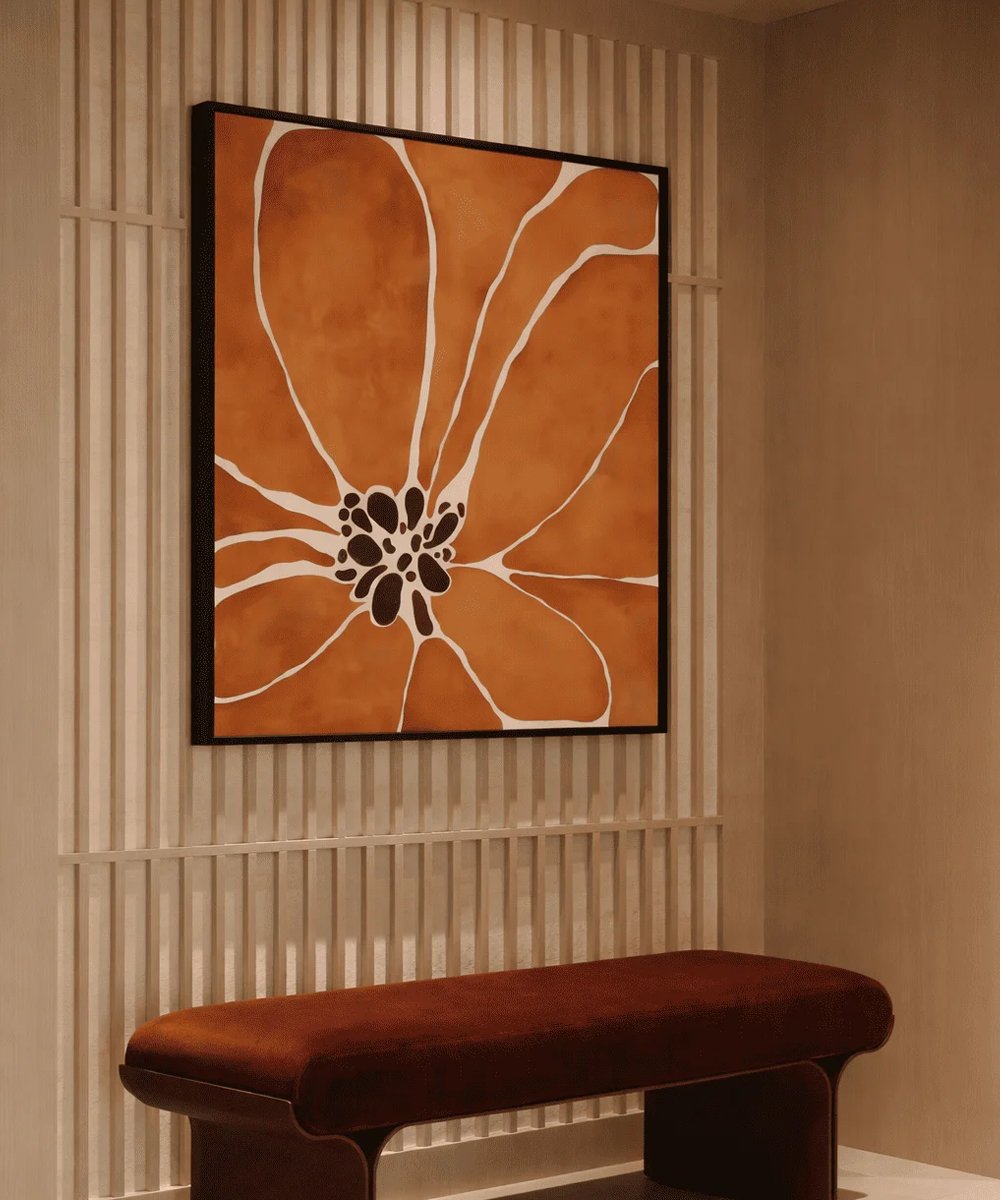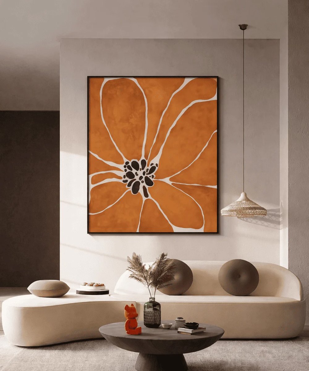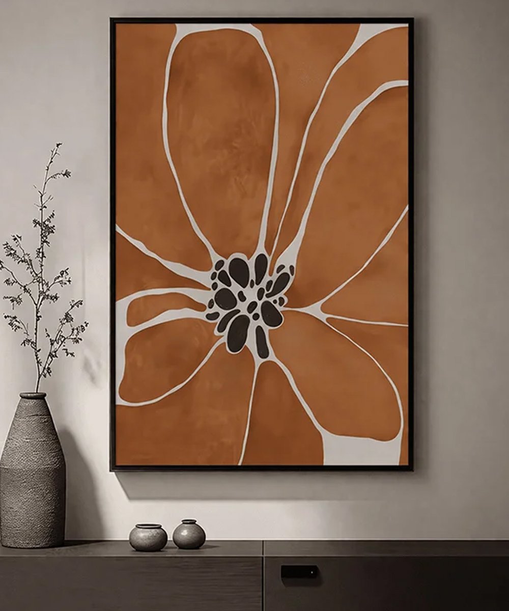 A stunning canvas print blending warm terracotta tones with a contemporary, minimal floral motif. Encircled in a premium wood frame, it brings sophisticated natural calm to living rooms, entryways, or bedrooms. Perfectly complements Mid-Century Modern and Japandi interiors.