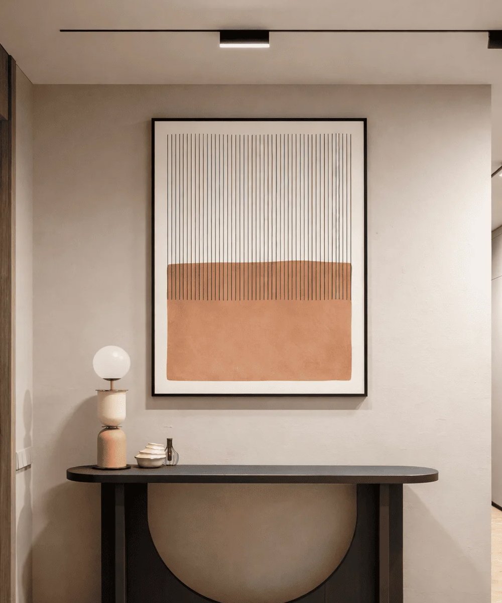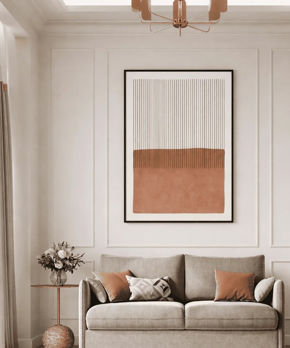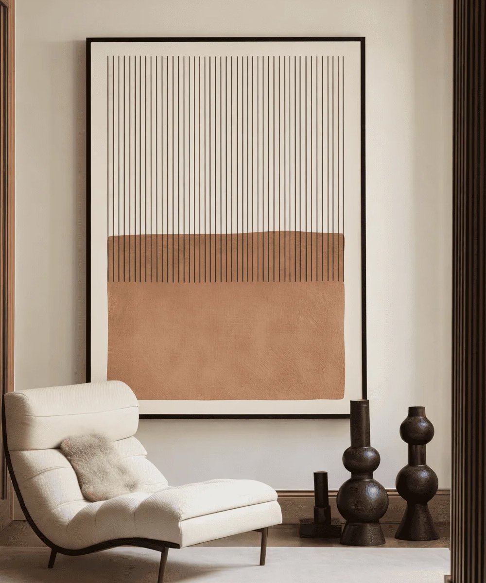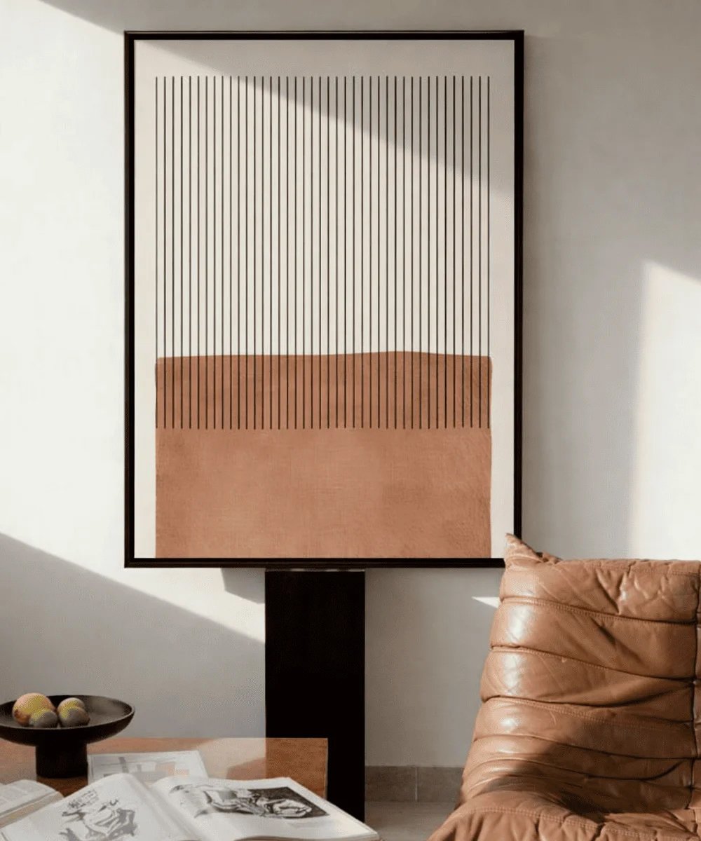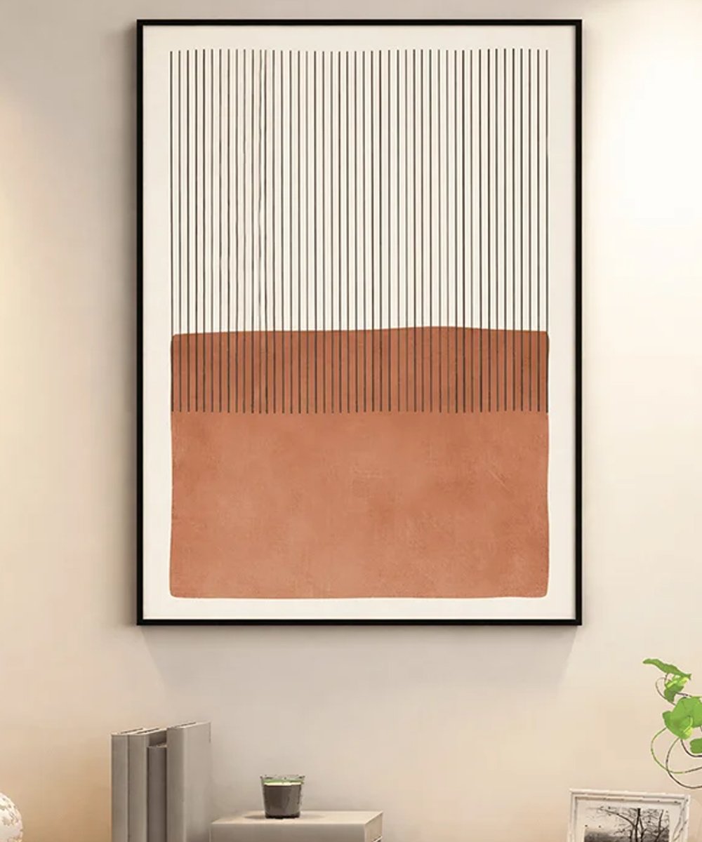 A masterclass in modern simplicity, the Linear Earth Canvas combines structural verticality with the warmth of the desert. Measuring 45 x 60 cm, its high-contrast terracotta and ink palette provides a sophisticated focal point for minimalist interiors. An ideal choice for Japandi, Scandinavian, or Contemporary styling.