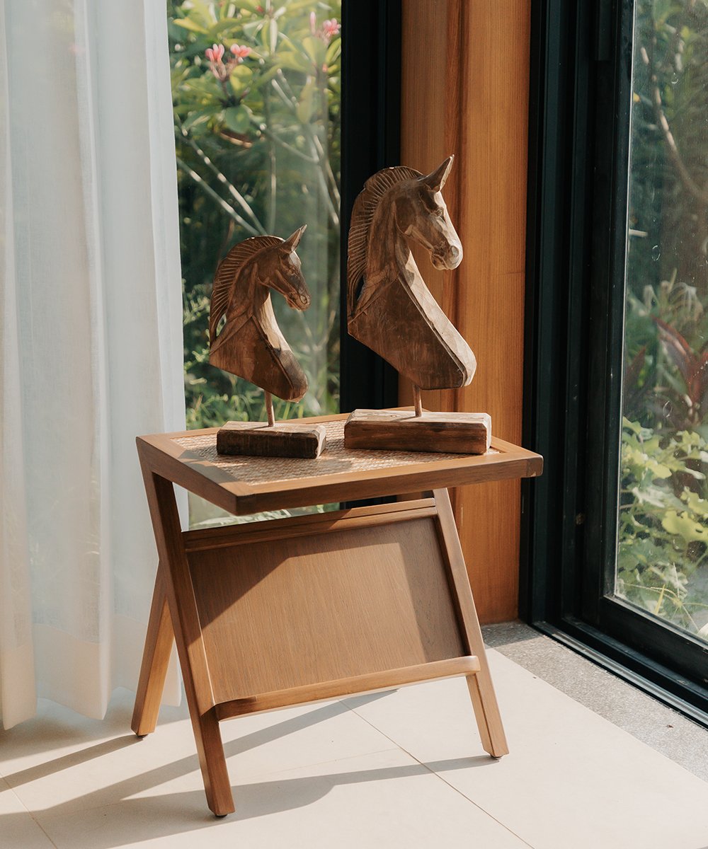 • Mixed Materiality: Combines a rich, solid wood structure with a woven rattan or cane-inlay top for a layered, organic texture.